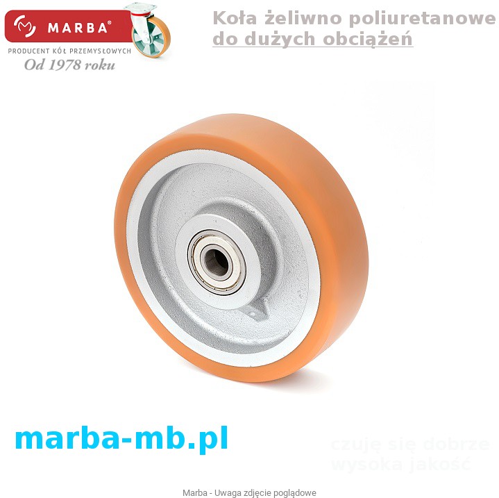 Trwałe połączenie wylewanego wysokiej jakości poliuretanu z piastą żeliwną koła przy zastosowaniu specjalnych klei, twardość 92º ShA, elastyczny, nie niszczący oraz nie brudzący posadzek, wytrzymały na ścieranie, przecięcia i dalsze rozrywanie, cichobieżny o małych oporach toczenia.