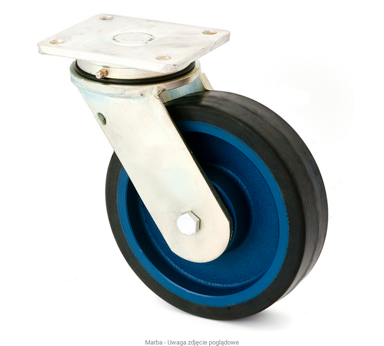 Koło : bieżnik z gumy czarnej „ELASTIK”® zwulkanizowany na piaście żeliwnej, duży komfort jazdy, twardość 68° ShA, elastyczny, nie niszczący nawierzchni, wytrzymały na ścieranie, przecięcia i dalsze rozrywanie, cichobieżny o małych oporach toczenia.