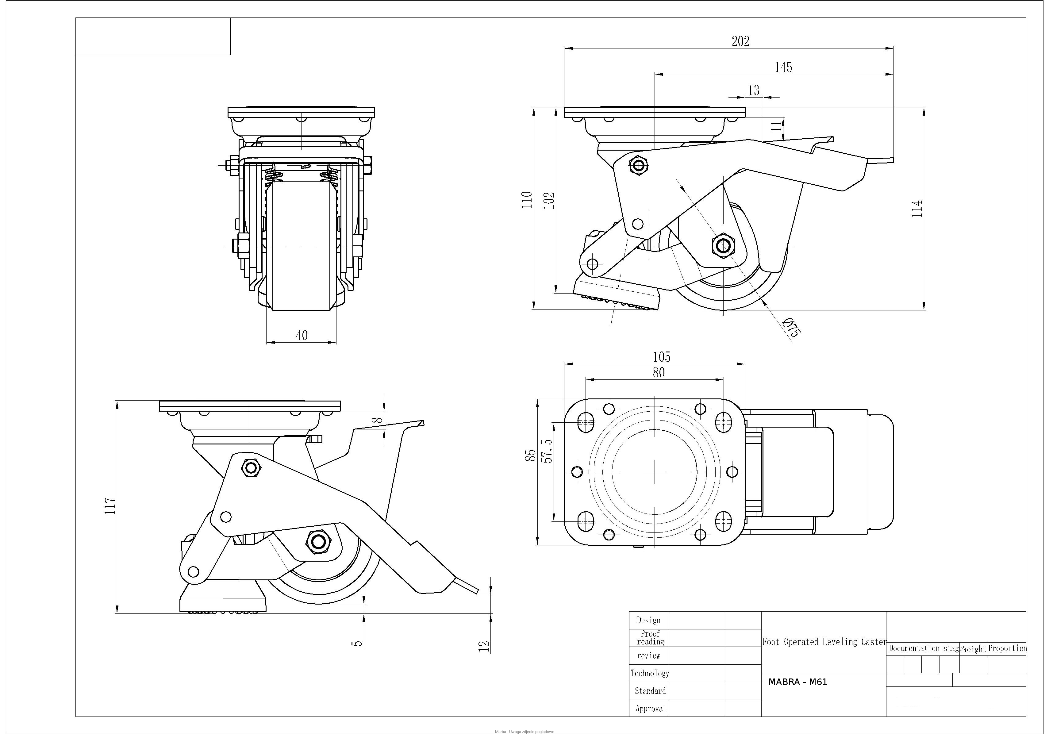 Koło ze stopką M61/080/KN jest to kółko poliamidowe w obudowie stalowej z pedałem nożnym. Najczęściej stosowane w podestach przy liniach produkcyjnych które wymagają częstego przestawiania i stabilności.