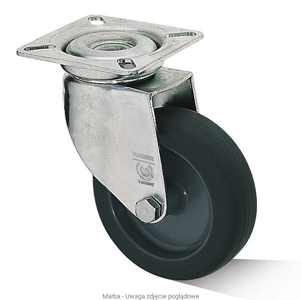 Koło : bieżnik z elastomeru TPE (t.z.w. zmiękczane PCV) o twardości 85ºShA, nie niszczący i nie brudzący posadzek, ma małe opory toczenia i skrętu, cichobieżny i wytrzymały na wiele czynników chemicznych i oleje.