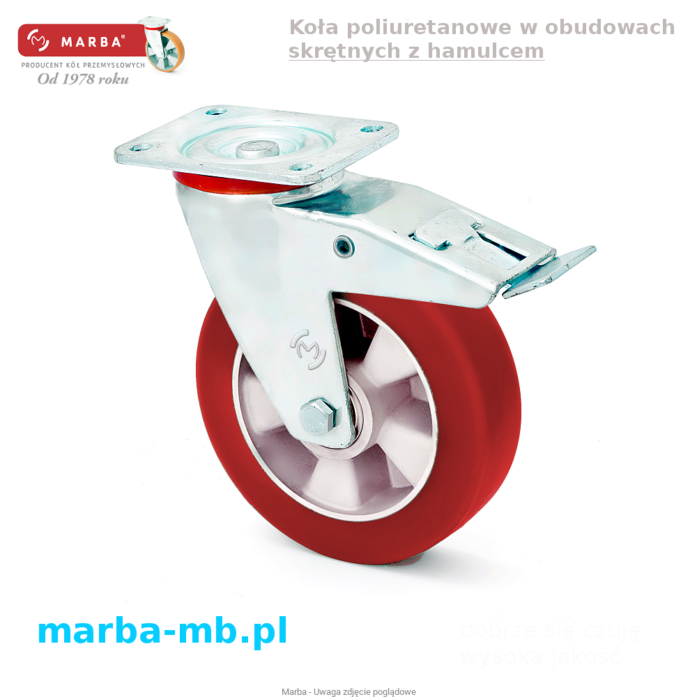 trwałe połączenie nalanego poliuretanu z piastą aluminiową koła przy zastosowaniu specjalnych klei, twardość 75º ShA, gruby bieżnik ze specjalnego elastycznego poliuretanu zapewniający duży komfort użytkowania na wszystkich rodzajach posadzek, nie niszczący oraz nie brudzący, bardzo dobra wytrzymałość na ścieranie, przecięcia i dalsze rozrywanie, cichobieżny o małych oporach toczenia.