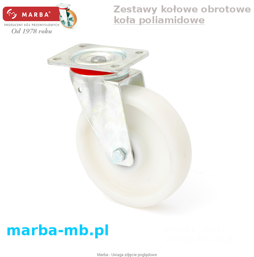 Koło : z wtryskiwanego poliamidu PA6, o bardzo niskich oporach toczenia i wytrzymałości na wiele czynników chemicznych. Temperatura pracy od -40ºC do +80ºC. Koła do równych nawierzchni.