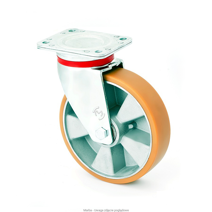 Koło : bieżnik z poliuretanu „MARBATHANE”®, niebrudzący, duży komfort jazdy, twardość 92° ShA, elastyczny, nie niszczący oraz nie brudzący posadzek, wytrzymały na ścieranie, przecięcia i dalsze rozrywanie, cichobieżny o małych oporach toczenia.