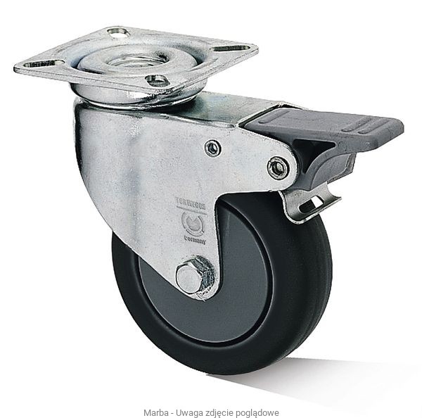 Koło : bieżnik z elastomeru TPE (t.z.w. zmiękczane PCV) o twardości 85ºShA, nie niszczący i nie brudzący posadzek, ma małe opory toczenia i skrętu, cichobieżny i wytrzymały na wiele czynników chemicznych i oleje.