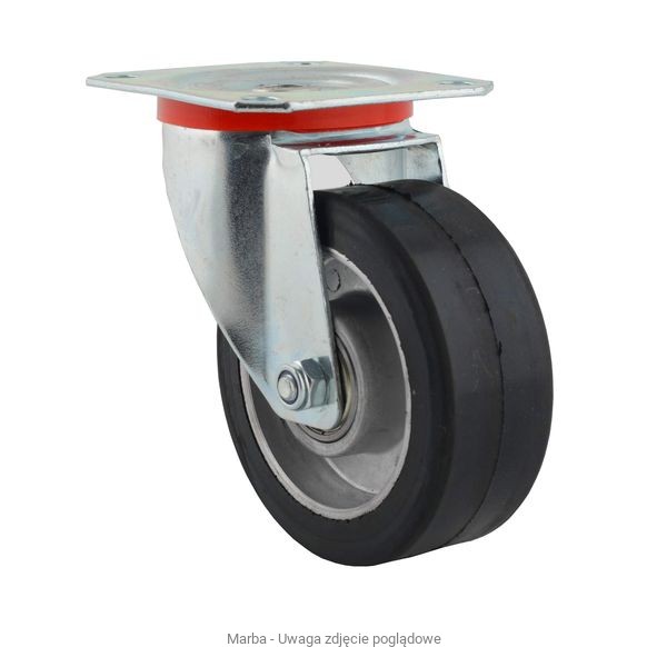 Koło : bieżnik z gumy czarnej „ELASTIK”® zwulkanizowany na piaście aluminiowej, duży komfort jazdy, twardość 68° ShA, elastyczny, wytrzymały na ścieranie, przecięcia i dalsze rozrywanie, cichobieżny o małych oporach toczenia, amortyzacja.