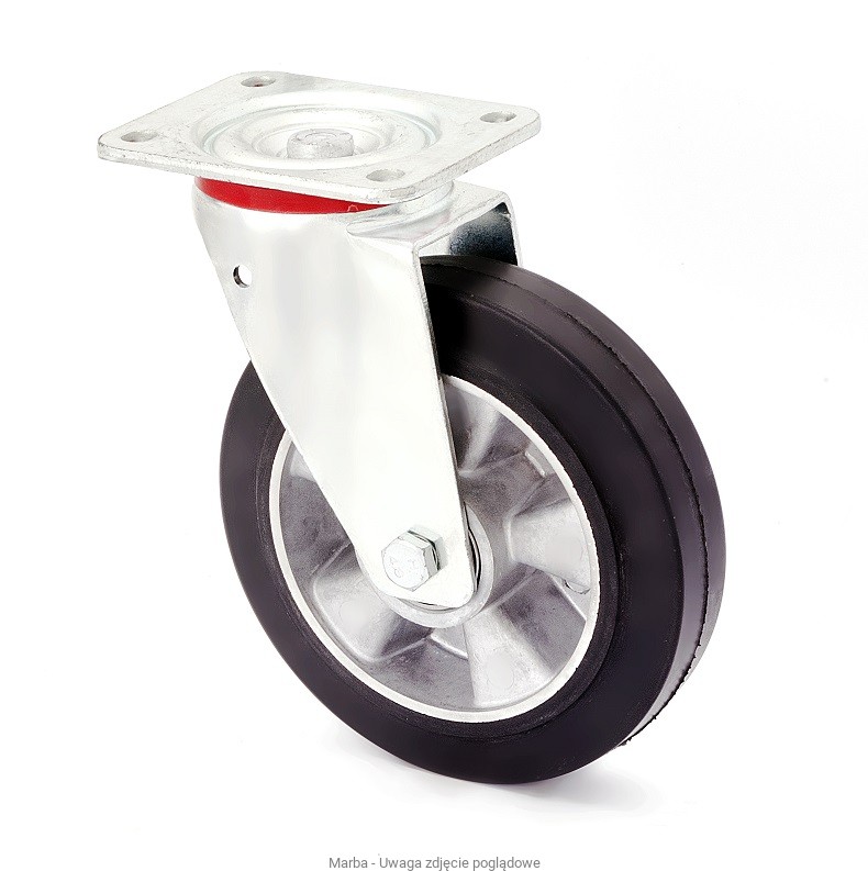 Koło : bieżnik z gumy czarnej „ELASTIK”® zwulkanizowany na piaście aluminiowej, duży komfort jazdy, twardość 68° ShA, elastyczny, wytrzymały na ścieranie, przecięcia i dalsze rozrywanie, cichobieżny o małych oporach toczenia, amortyzacja.